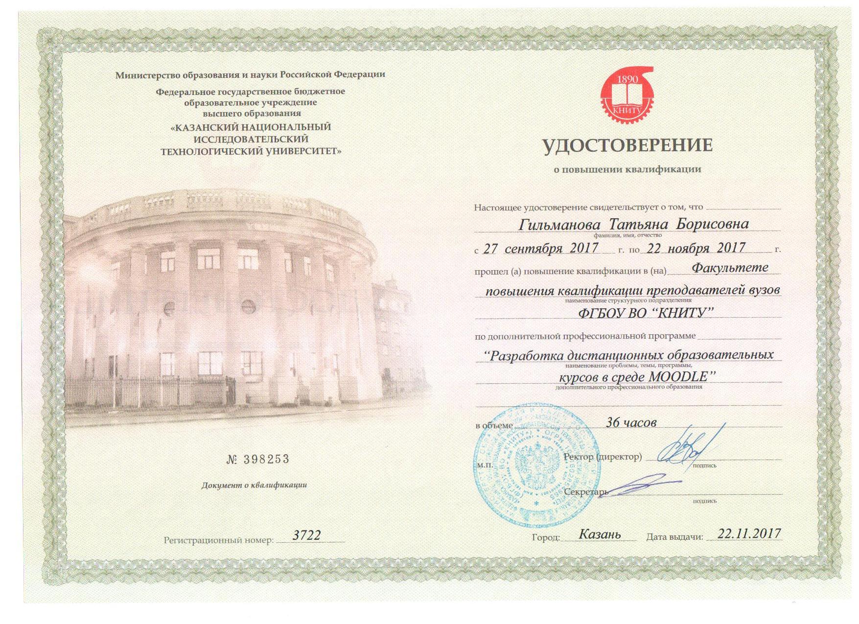 01.10.2004 - 30.06.2005, час. Диплом о профессиональной переподготовке, серия: ПП, номер: 744487. Выдан: КГТУ. Программа: Педагогика высшей школы.