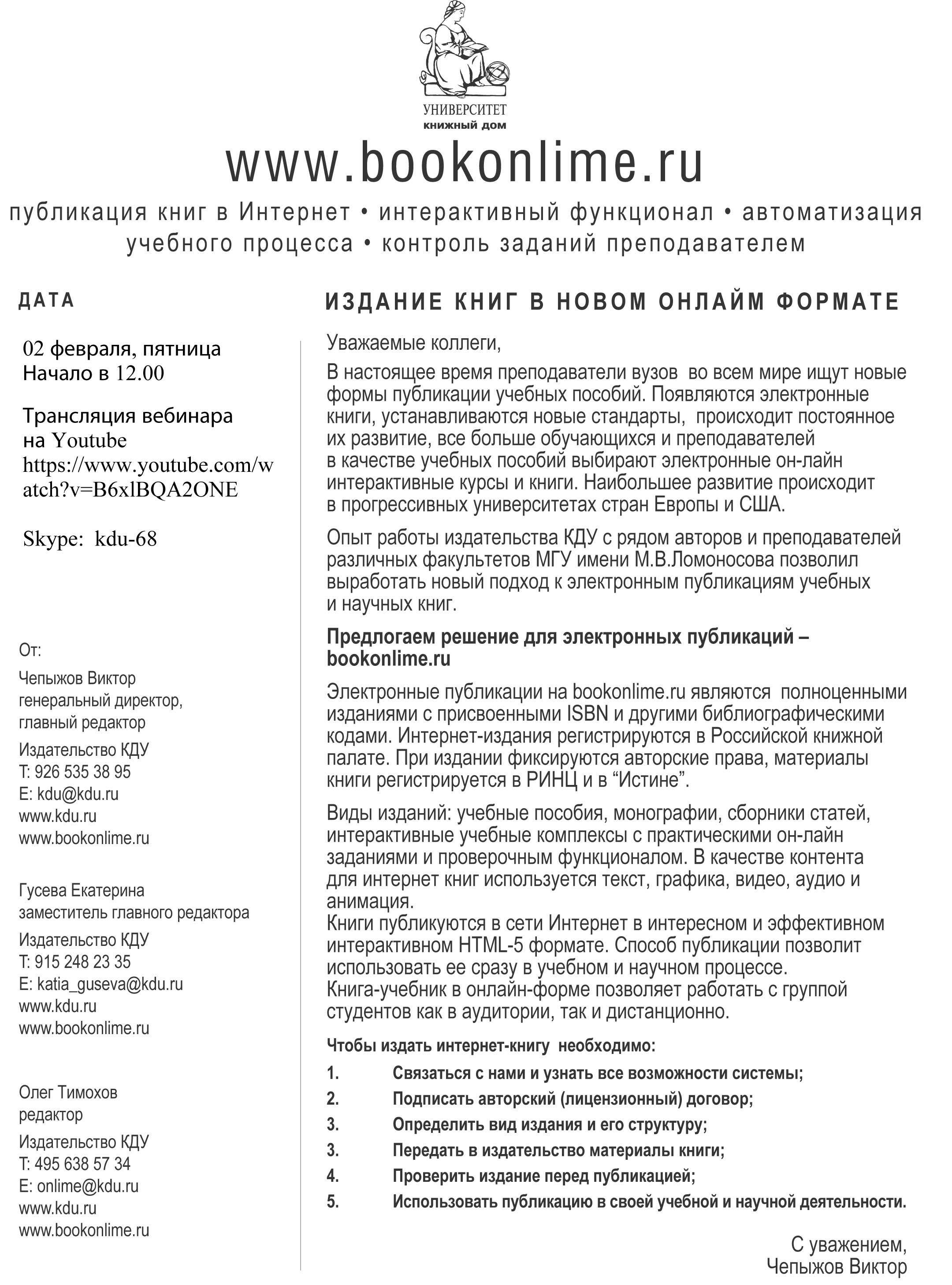 Уважаемые коллеги, В настоящее время преподаватели вузов во всем мире ищут новые формы публикации учебных пособий. Появляются электронные книги, устанавливаются новые стандарты, происходит постоянное их развитие, все больше обучающихся и преподавателей в качестве учебных пособий выбирают электронные он-лайн интерактивные курсы и книги. Наибольшее развитие происходит в прогрессивных университетах стран Европы и США. Опыт работы издательства КДУ с рядом авторов и преподавателей различных факультетов МГУ имени М.В.Ломоносова позволил выработать новый подход к электронным публикациям учебных и научных книг. Предлагаем решение для электронных публикаций - https://bookonlime.ru/ Электронные публикации на bookonlime.ru являются полноценными изданиями с присвоенными ISBN и другими библиографическими кодами. Интернет-издания регистрируются в Российской книжной палате. При издании фиксируются авторские права, материалы книги регистрируется в РИНЦ и в “Истине”. Виды изданий: учебные пособия, монографии, сборники статей, интерактивные учебные комплексы с практическими он-лайн заданиями и проверочным функционалом. В качестве контента для интернет книг используется текст, графика, видео, аудио и анимация. Книги публикуются в сети Интернет в интересном и эффективном интерактивном HTML-5 формате. Способ публикации позволит использовать ее сразу в учебном и научном процессе. Книга-учебник в онлайн-форме позволяет работать с группой студентов как в аудитории, так и дистанционно. Чтобы издать интернет-книгу, необходимо: