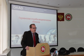 According to the agreement between DAAD and the Ministry of Education and Science of the Republic of Tatarstan, in the framework of granting program of the Government of the Republic of Tatarstan – “Algarysh”, Thilo Zinecker presented two academic international exchange programs for Tatarstan students. “Evgeniy Zavoyskiy” program for 1-3 month training of post-graduate students in Germany and “Nikolay Lobachevskiy” program for two-year training of graduate students.