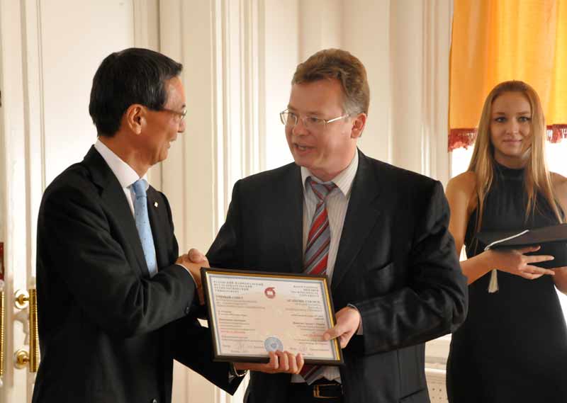 Le president de la Republique de Tatarstan Roustam N. Minnikhanov, le president de la compagnie «Yokogawa», le docteur honorable de l'UNRTK Chouzo Kajkhori, Le president de l'UNRTK German S. Dyakonov
