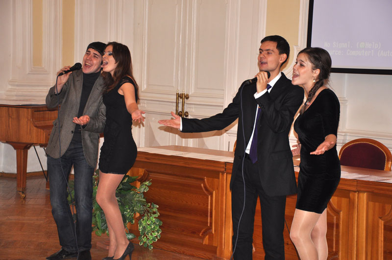 Дмитрий Юдин, Валерия Ольтаржевская, Дмитрий Мельник и Антонина Яковлева исполняют песню об университете