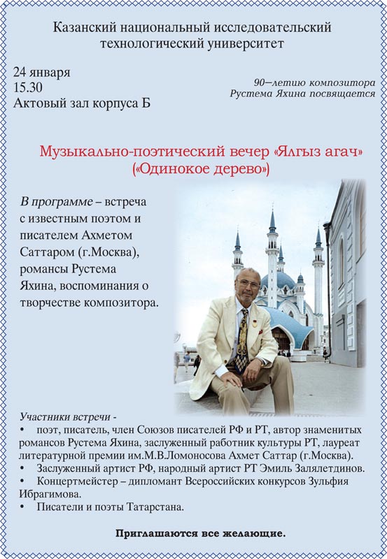 В КНИТУ состоится музыкально-поэтический вечер, посвященный 90-летию композитора Рустема Яхина.