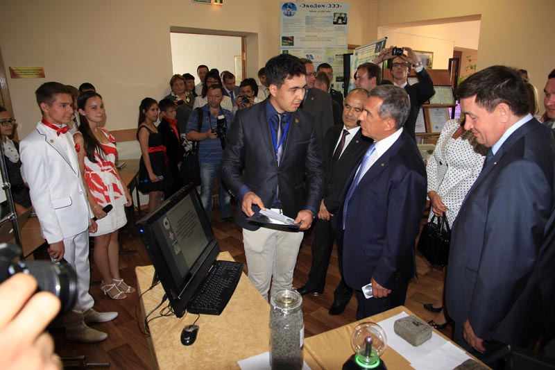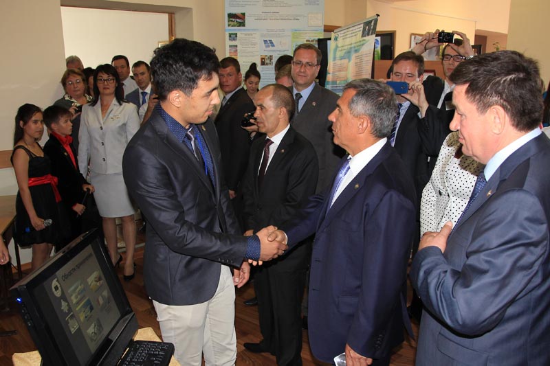 Президент Республики Татарстан Рустам Минниханов и студент-дипломник кафедры плазмохимических и нанотехнологий высокомолекулярных материалов КНИТУ Гарифуллин Айдар