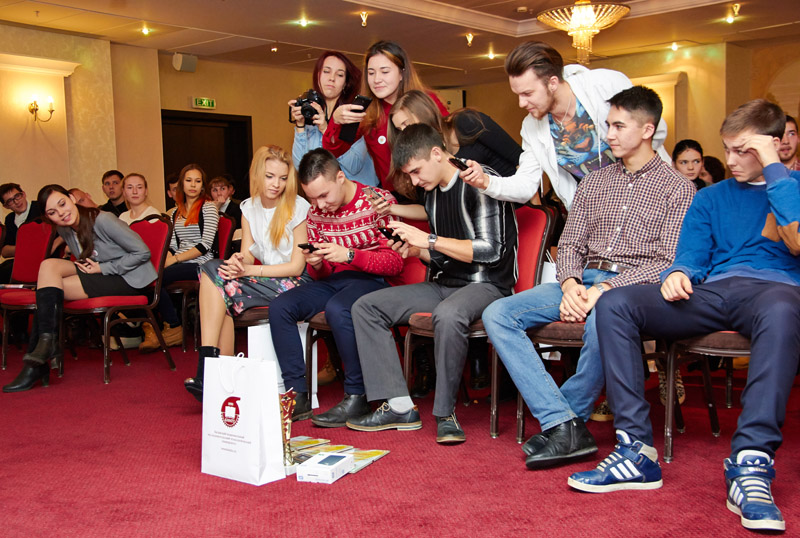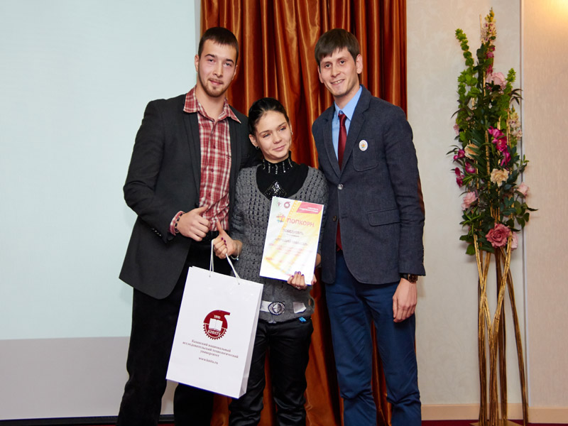 Заместитель Председателя профкома КНИТУ Динар Хафизов вручает приз за "Лучший замысел" команде "Efimыч Production"