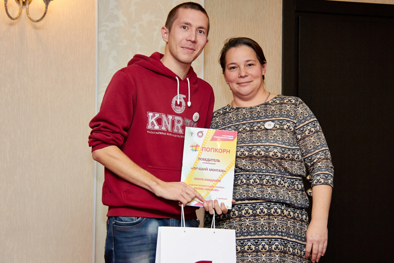 Режиссер телеканала ТНВ Тамара Ишметова вручает приз за "Лучший монтаж" Эмилю Хамдамову