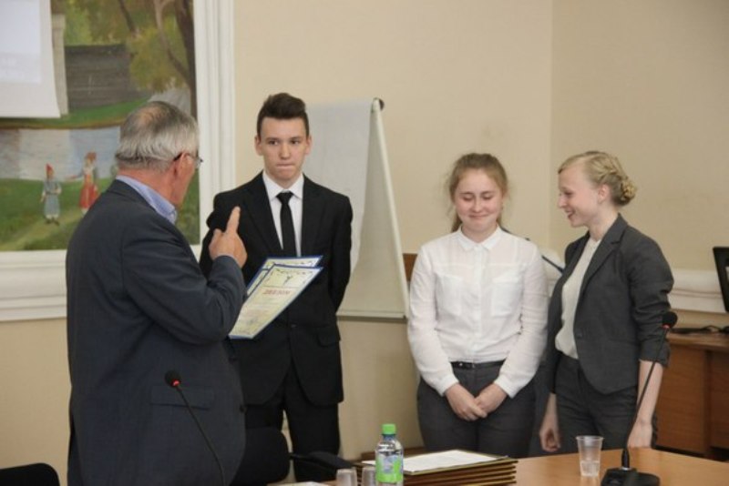 Зампредседателя правления Торгово-промышленной палаты В.А.Герасимов вручает дипломы представителям клуба юных предпринимателей 86-й школы