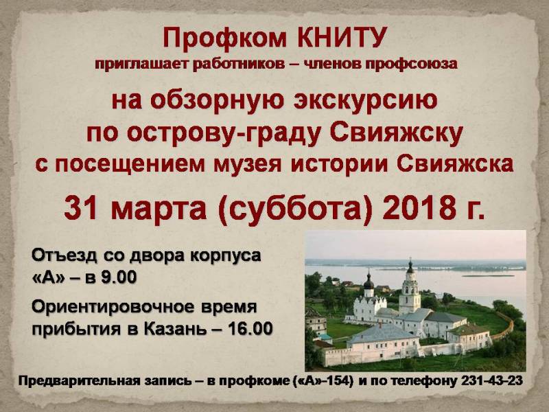 Профком КНИТУ приглашает работников вуза – членов профсоюза на обзорную экскурсию в г.Свияжск