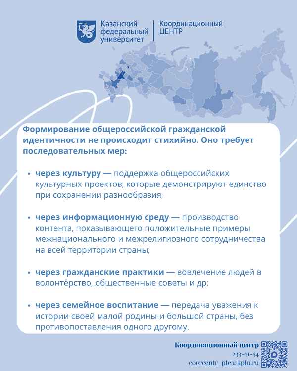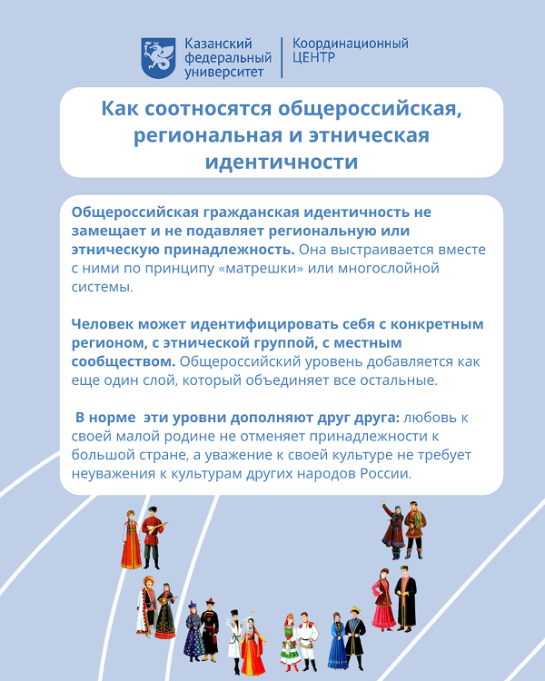 Сильная локальная идентичность и единство большой страны не противоречат друг другу: общероссийская гражданская идентичность выступает общей рамкой, внутри которой разные уровни принадлежности не заменяют, а дополняют друг друга. Без этого слоя общество становится хрупче.