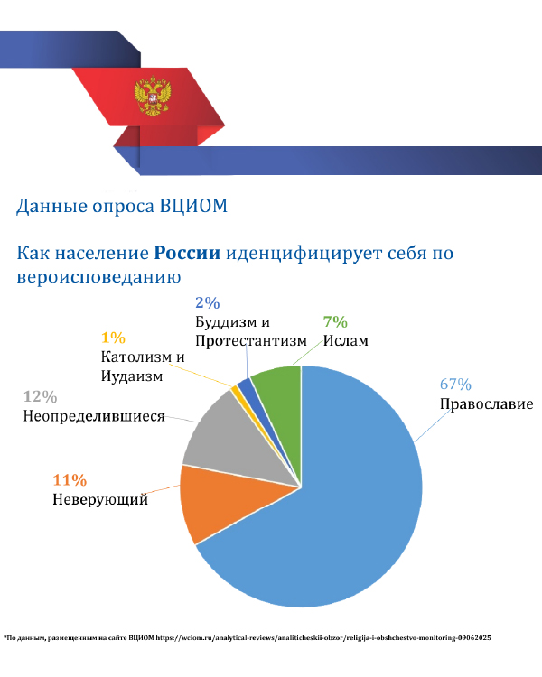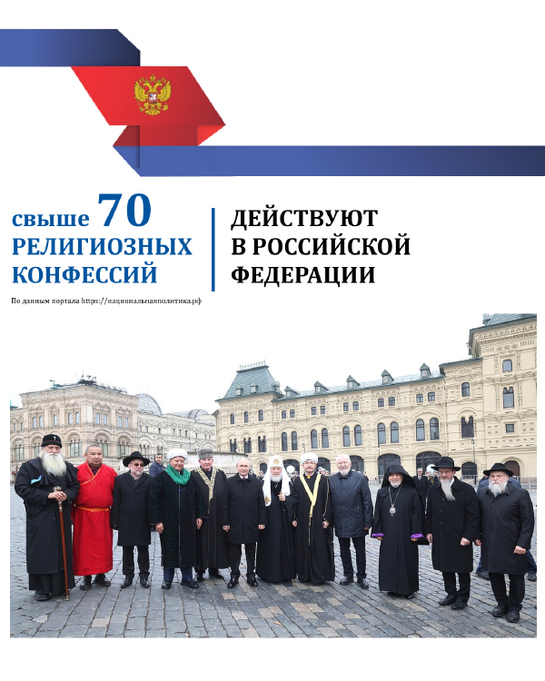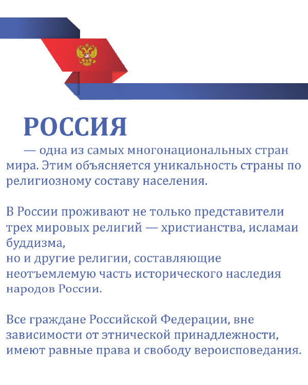 Россия — одна из самых многонациональных и многоконфессиональных стран мира, где христианство, ислам, буддизм, иудаизм и другие религии сосуществуют в рамках светского государства. При этом свобода совести закреплена Конституцией и федеральным законом, а данные опросов показывают реальный религиозный баланс в обществе.