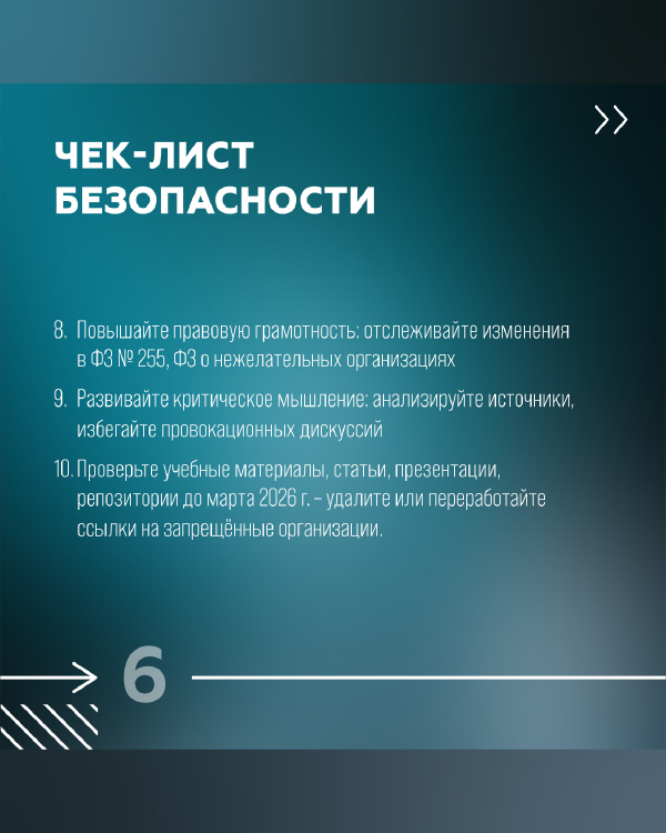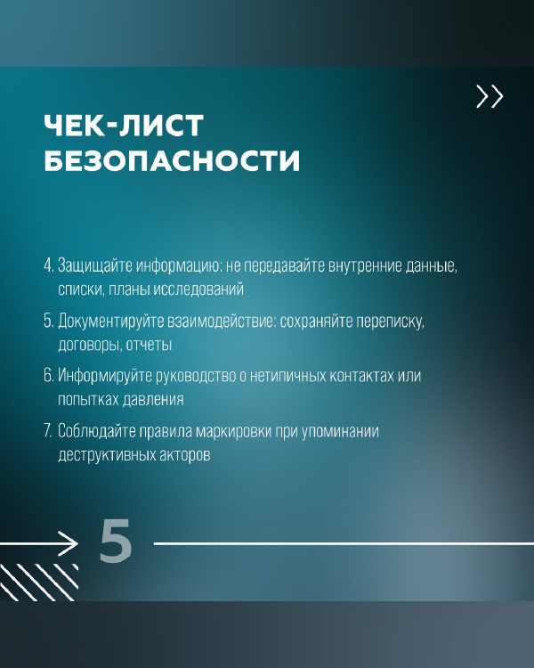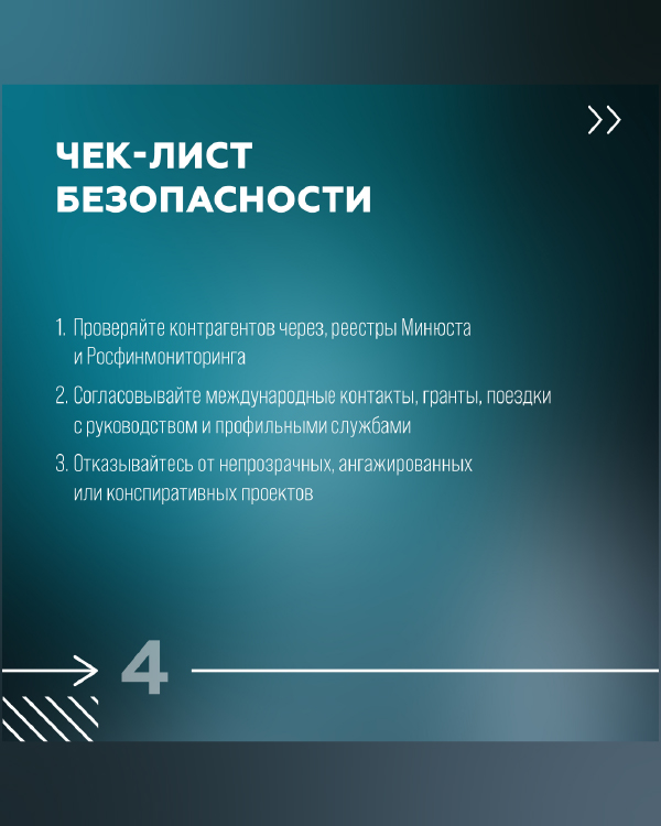 Рекомендуем ознакомиться с чек-листом на карточках. Он включает проверку контрагентов через реестры Минюста и Росфинмониторинга, согласование международных контактов, защиту внутренних данных, документирование взаимодействий, ревизию учебных материалов и ссылок, размещённых до марта 2026 года.