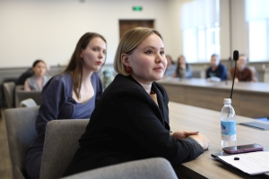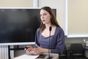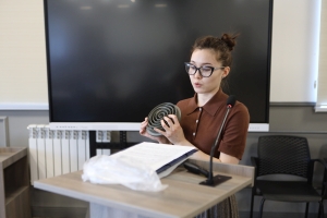 Первой выступила Камила Власенкова, ассистент и аспирант кафедры ВТЭУ. Её самопрезентация называлась «Инженерная мысль и педагогическое мастерство: от производства к науке и кафедре». Такое название не случайно: Камила, выпускница бакалавриата 2022 года, во время обучения в магистратуре работала инженером-технологом на инструментальном производстве АО «Вакуумммаш», занималась механообработкой металлов и проектированием оснастки. Реальный опыт работы с уникальным оборудованием очень помогает ей теперь «на пальцах» объяснять студентам сложные технические процессы.