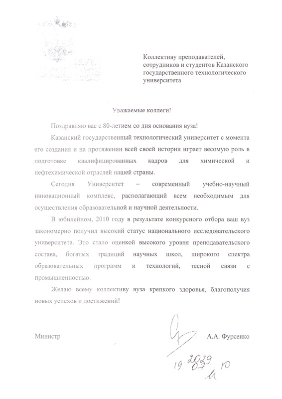 Коллектив преподавателей, сотрудников и студентов Казанского государственного технологического университета поздравляет с 80-летием со дня основания вуза и с получением статуса национального исследовательского университета Министр образования и науки РФ Фурсенко Андрей Александрович
