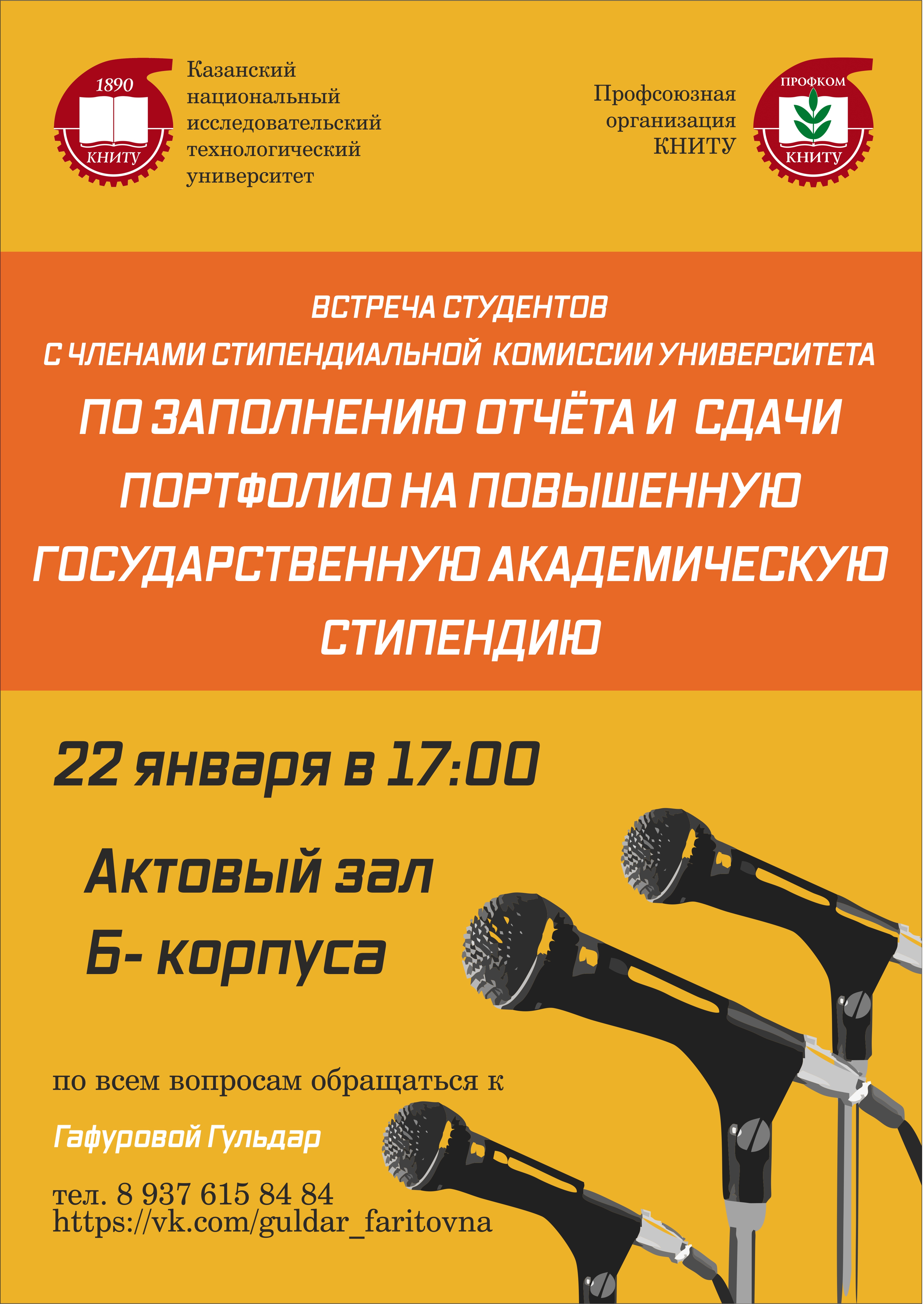 22 января 2018 года в Актовом зале корпуса "Б" КНИТУ в 17.00 состоится встреча студентов с членами стипендиальной комиссии университета по заполнению отчета и портфолио, согласно критериям, для подачи на повышенную государственную академическую стипендию (ПГАС).